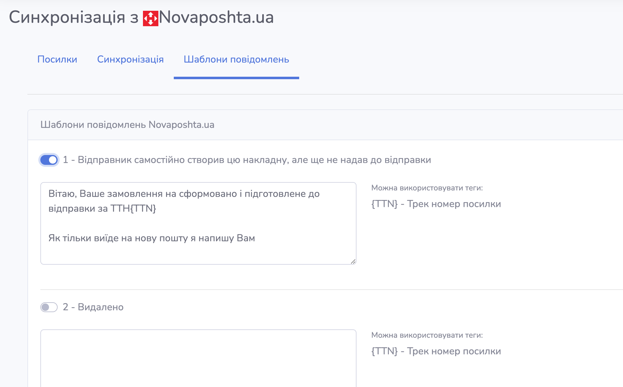 Тут вже Бачимо і зміни статусів посилок, а також при певних статусах відправляється певний шаблон.
