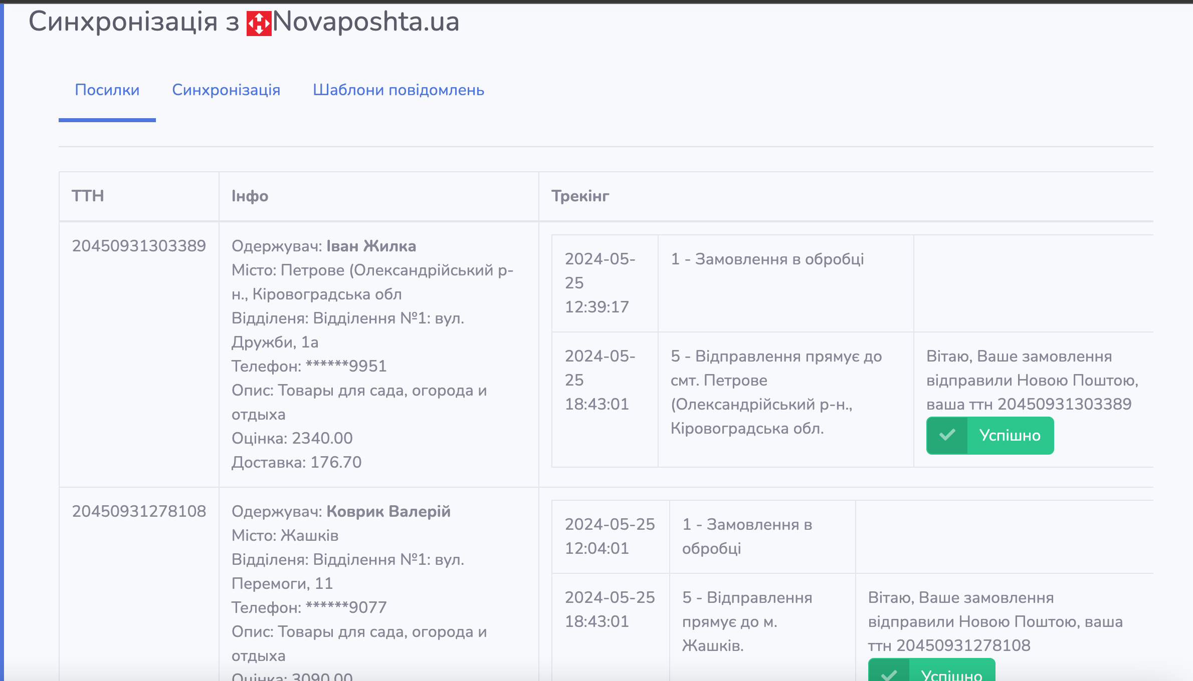 Після успішної синхронізації, у розділі посилки будуть відображатись всі посилки з вашого кабінету нової пошти.