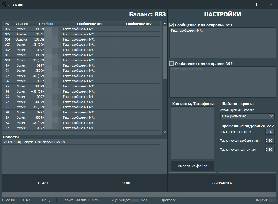В данной версии реализована возможность создавать рассылки из списка. Для этого достаточно ввести список телефонов, а так же текст сообщения или нескольких сообщений. После нажатия "Старт" начнется симуляция действий пользователя, то есть Click Uni сама откроет Viber, введет номер телефона и если этот номер зарегестрирован в Viber, то ему будут отправлены подготовленные сообщения.